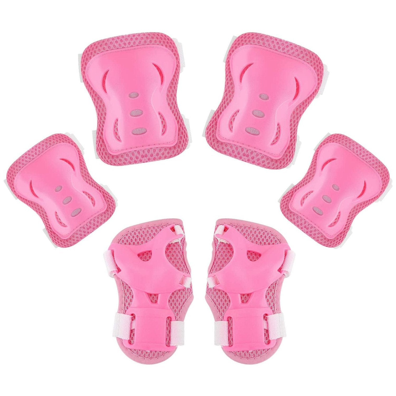 Set of child knee, elbow and wrist pads for skating and riding bikes and scooters. Pads feature foam cushion to absorb impact, hard plastic slide-able caps to protect. Thorough stitching and riveted caps provide durability, while soft fleece interior comforts and absorbs sweat. The pads' flex Velcro straps, meanwhile, offer full freedom of movement while still fastening the pads securely in place. The pads are built to soften the blow from pavement and other hard surfaces, with foam cushion interiors for comfort and hard plastic slide-able caps on the exteriors to help deflect impacts.
